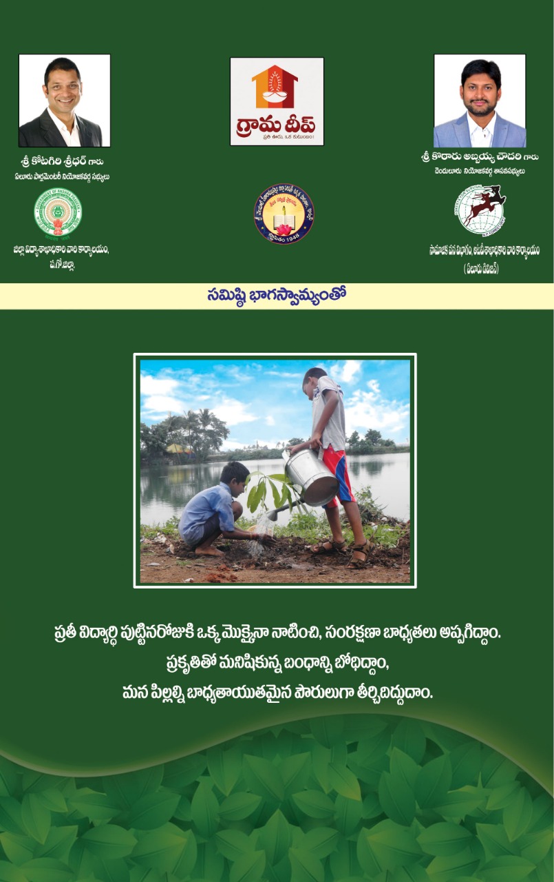 Member of Eluru Parliament Constituency, Shri Kotagiri Sridhar, Denduluru Assembly Constituency, Shri Abbayya Chowdary and six other assembly constituencies, Office of the West Godavari District Educational Officer; office of the Eluru Divisional Forest Officer (Social Forestry) and Kovvali Z. P. High School. 'Naa Vuupiri', the first breath from which the human is associated with nature, this program aims to make children understand the bond with nature from the time of birth. Making every child in the high schools of Eluru Parliamentary Constituency plant a tree on their birthday in the school premises, at home or in the village and adopt it, this collaborative program aims to plant at least 100,000 plants this academic year. Eluru MP, Mr.Sridhar not only showed enthusiasm to title the program as, Naa Vuupiri but also is funding the green registers to all the class teachers in schools to record the data and is also funding the program. This will be implemented in the assembly constituencies of Denduluru, Unguturu, Chintalapudi, Polavaram, Nuzvid, Kaikalur and Eluru.
